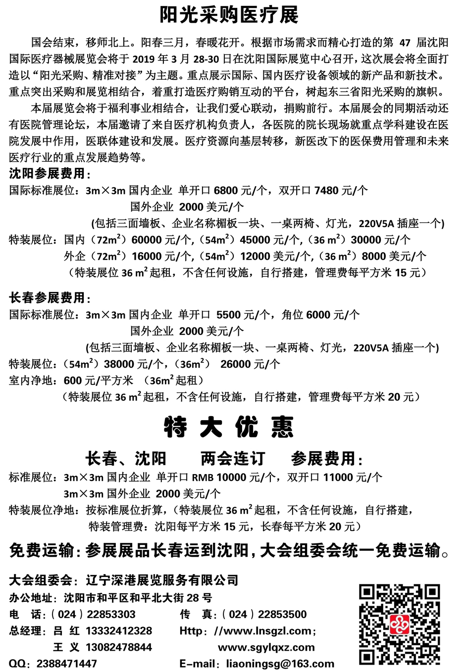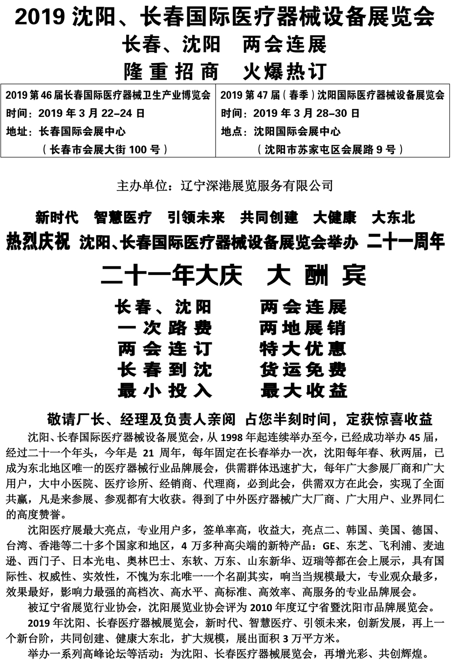 | 2019沈陽(yáng)、長(zhǎng)春醫(yī)療器械設(shè)備展覽會(huì) 兩會(huì)連展 特大優(yōu)惠! | |