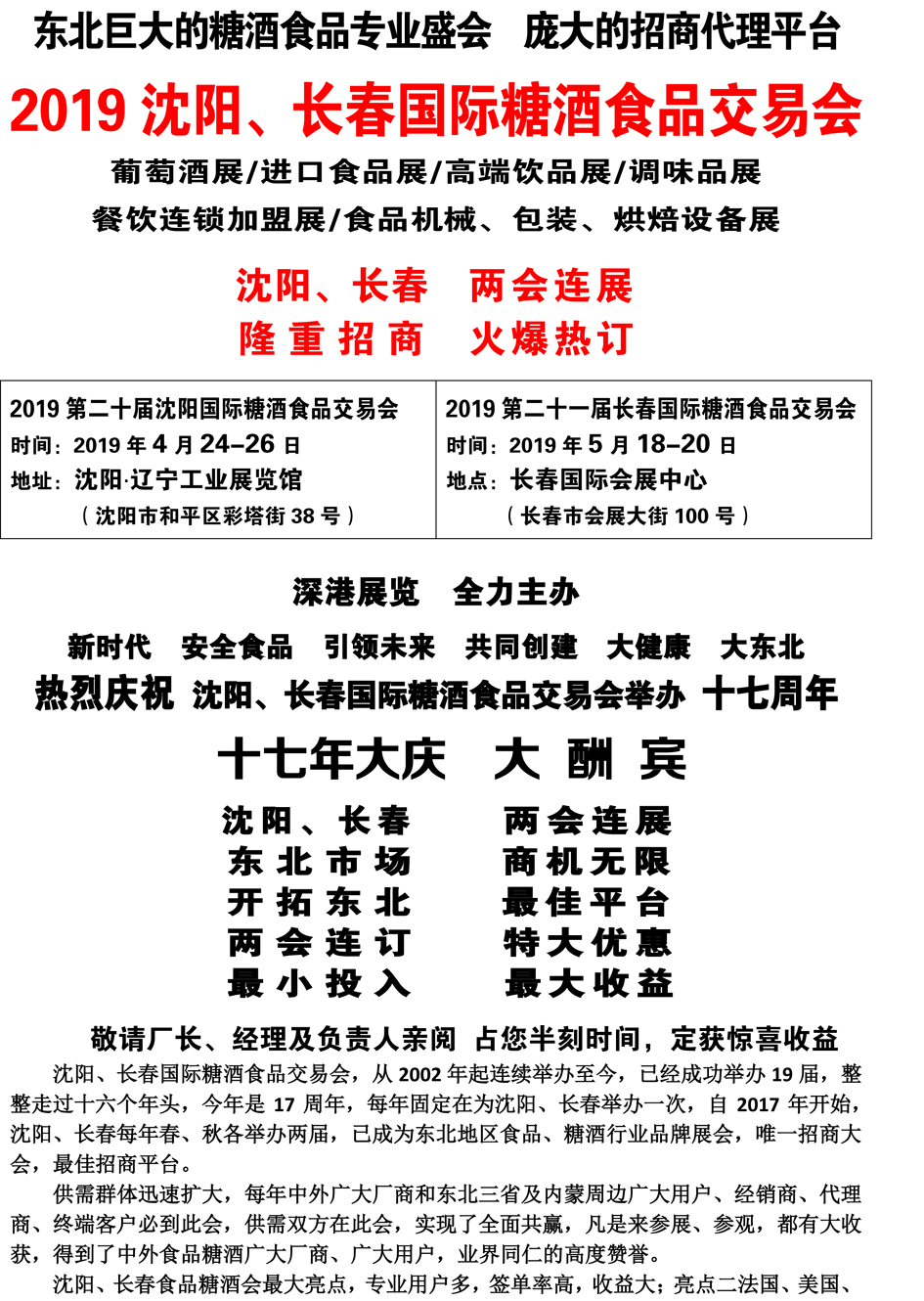 | 2019沈陽4月、長春5月國際糖酒食品交易會 兩會連展 特大優(yōu)惠! | |