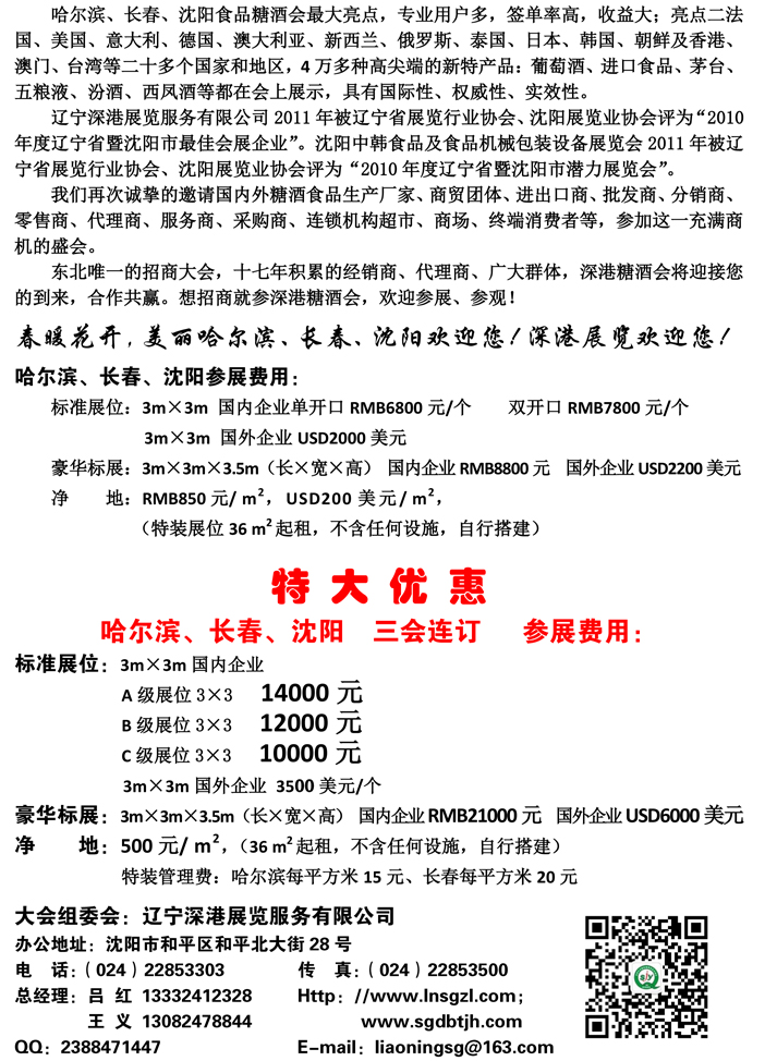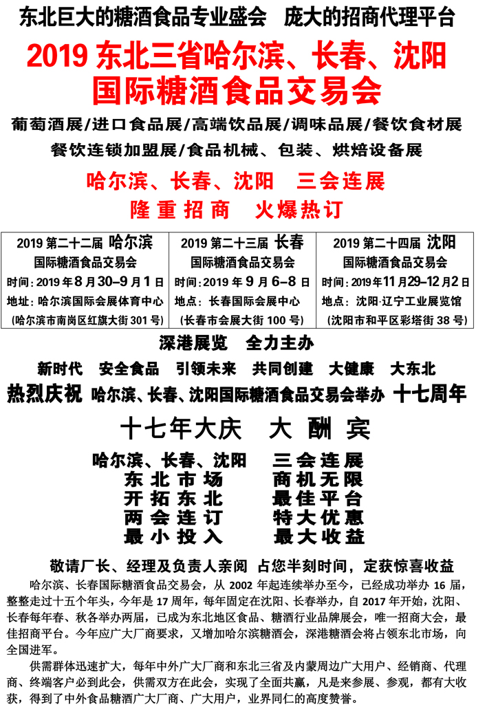 | 2019東北三省哈爾濱、長春、沈陽食品糖酒會三會連展 展位有限 特大優(yōu)惠! | |