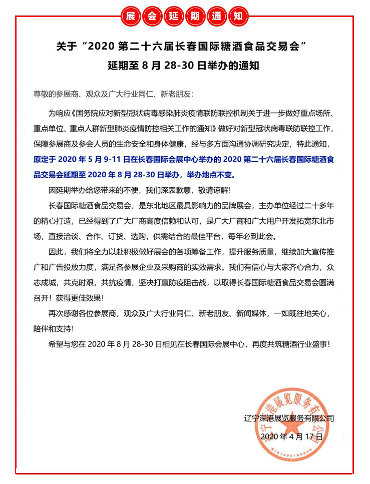 | 【重要通知】關于“2020第二十六屆長春國際糖酒食品交易會”延期至8月28-30日舉辦的通知 | |